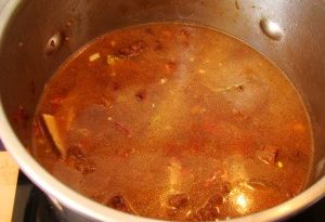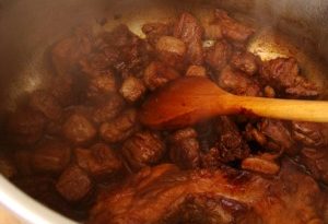Coupez la viande en petits morceaux de 2cm. Saisissez la viande dans l’huile chaude additionnée de sucre. Une fois la viande uniformément colorée, ajoutez l’oignon coupé en petits dés et l’oignon pays.