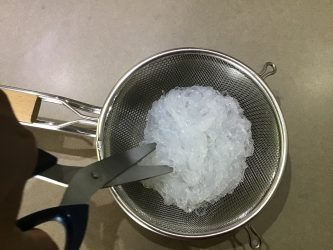 Hachez les champignons noirs. Coupez les vermicelles à l’aide d’une paire de ciseaux.