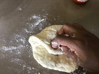 Déposez la pâte sur un plan de travail fleuré et pétrissez-la 5 min, sans rajoutez d’eau ni de farine.